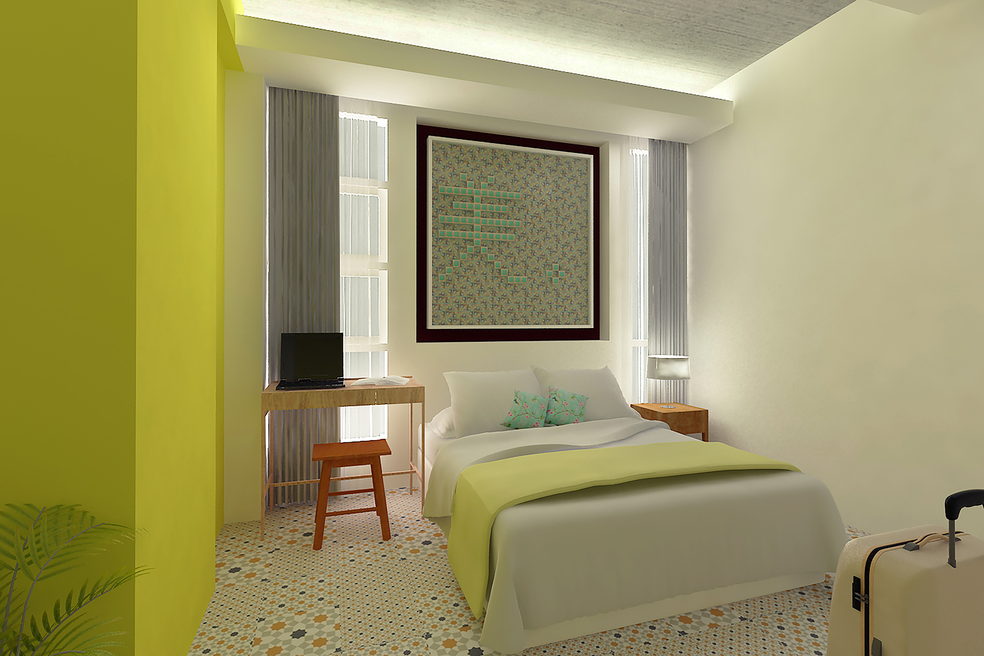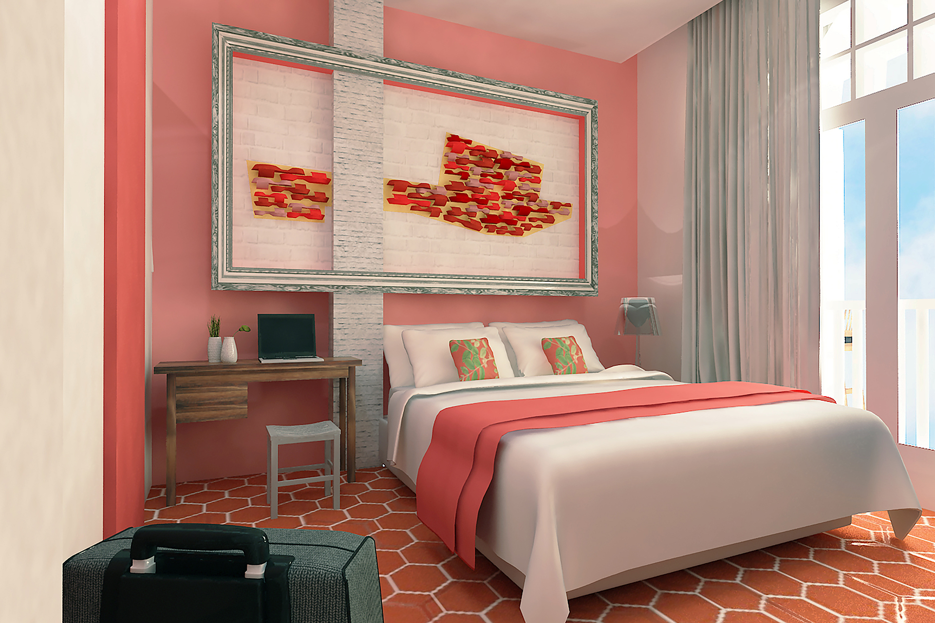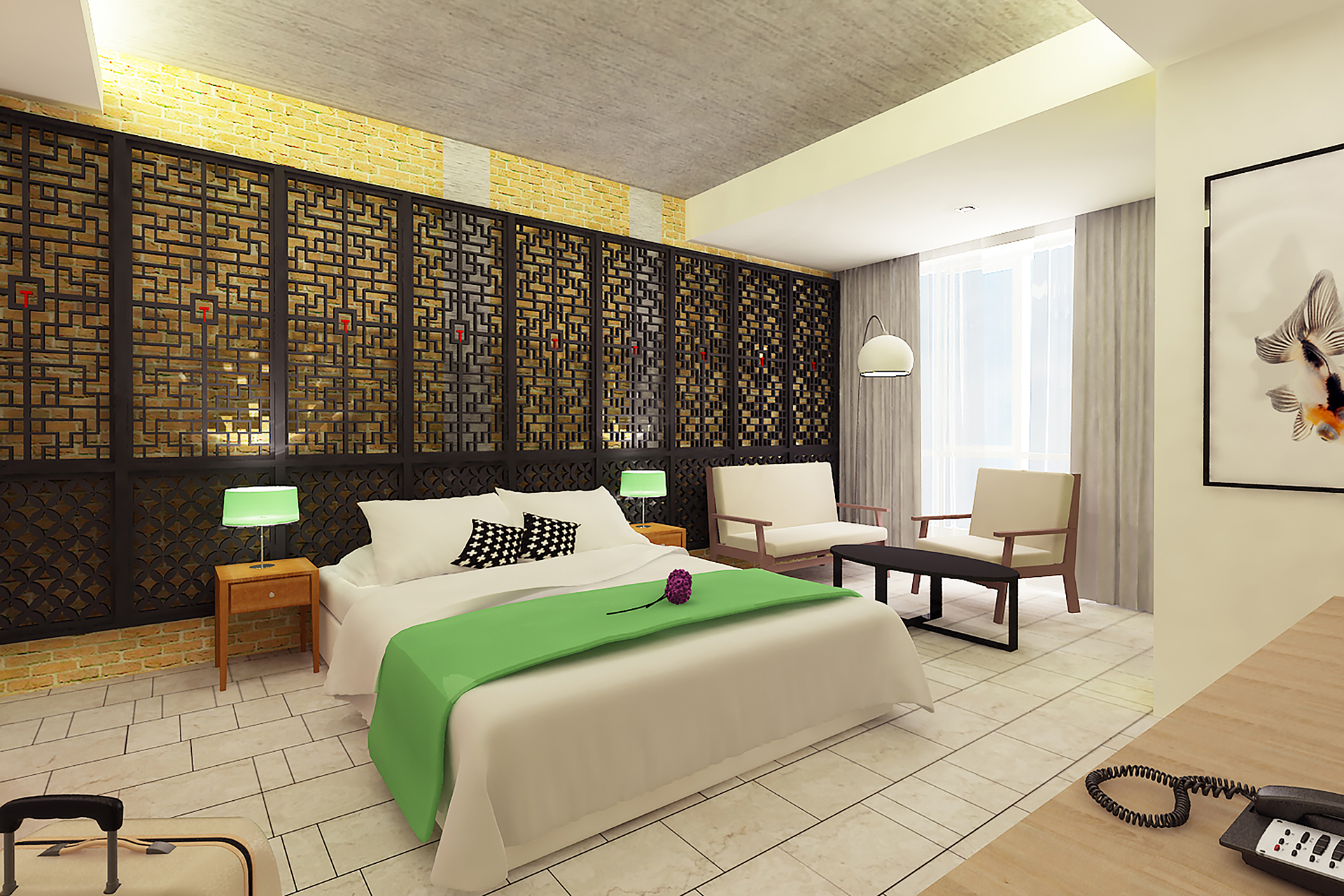 Traditional Chinese architecture is iconic for a variety of elaborate features, with latticework being one of its most recognisable. Seen in furnishings like doors, partitions, windows and folding screens, they boast of geometric motifs that are as much a visual treat as a study in Chinese symbolism. Presented as a wall installation in the Screen Suite, the time-honoured trait transforms into a contemporary art piece and lends a regal outlook to the generous space that fits a living lounge beside a cushy bed meant for two.