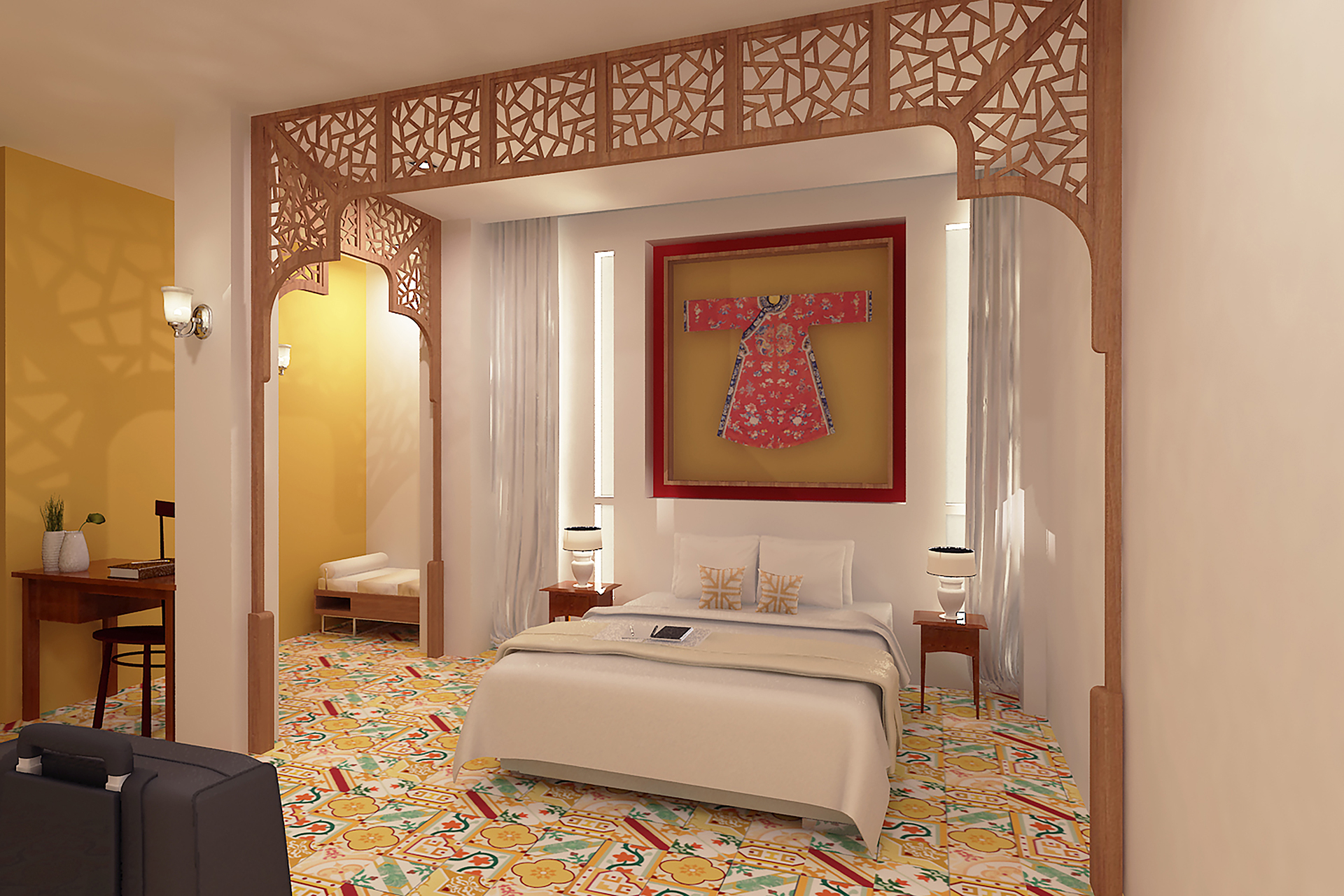 Whether it’s a simplistic platform or a decorated canopy, the bed is the most important component that can elevate the comfort of an everyday room to the intimacy of a boudoir. Fusing the two, the Lattice Room is a study in contrast: Luxury that is contemporary yet steeped in heritage, all bathed in warm undertones. A finely-carved lattice arch, modelled after antique Chinese folding screens, frames the sleep area to create an inviting room within a room, hinting at tranquil slumber.
