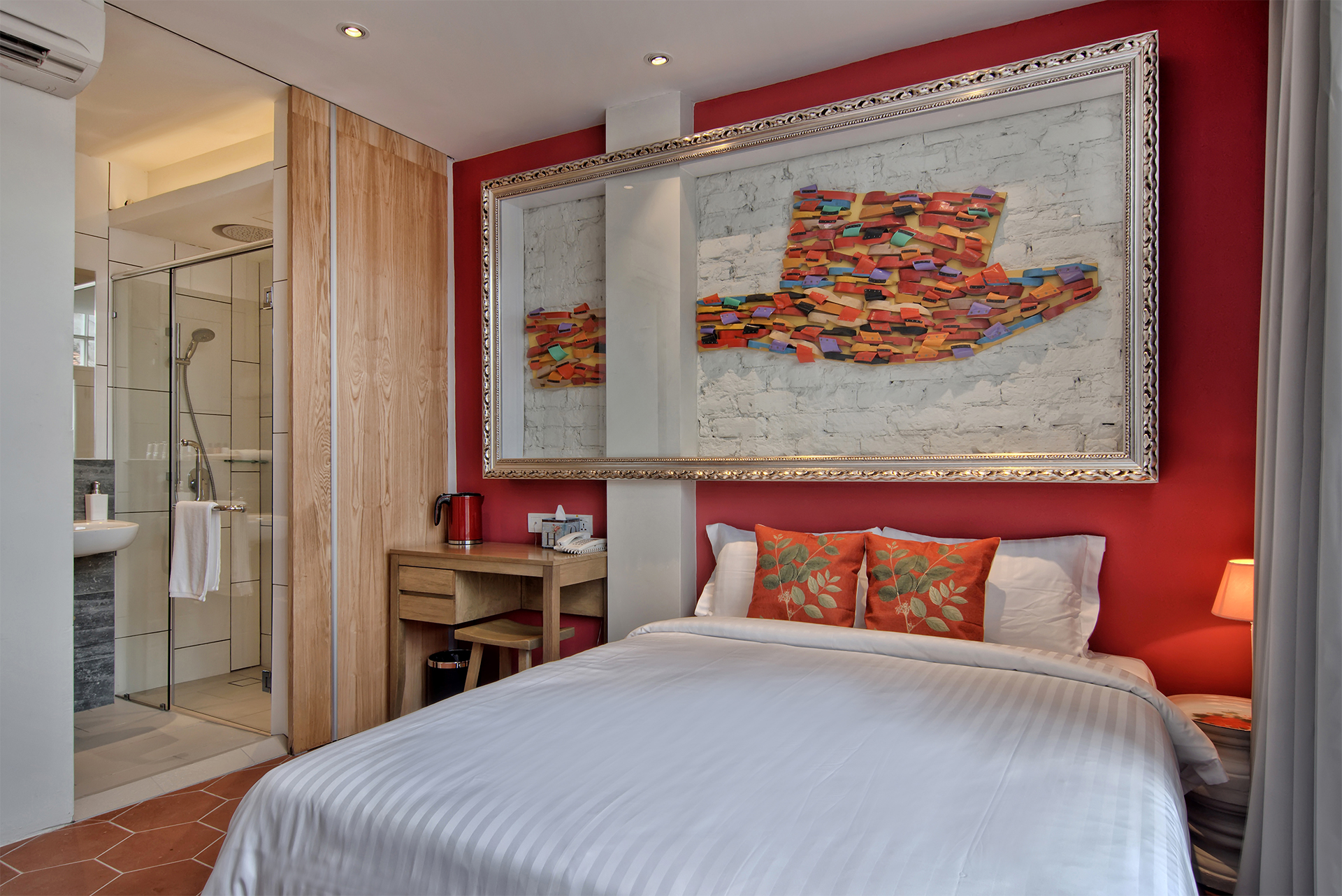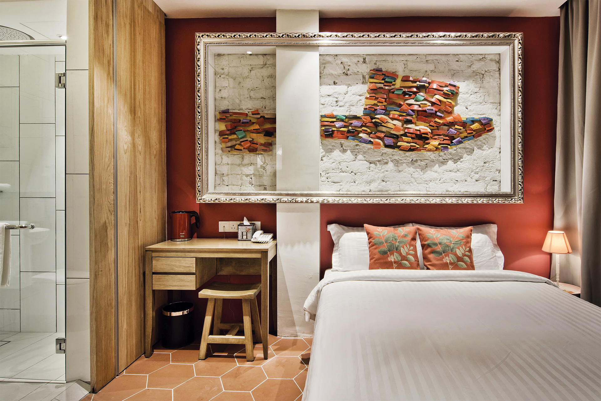 The clip-clop of wooden clogs used to permeate the streets of Melaka, back in the day when they were the footwear of choice among the Chinese. Built of raised soles, they were finished with a plastic band across the top of the foot that was traditionally red for women and green for men. Over the years, usage dwindled but their popularity as souvenirs rose as did the spectrum of colours they come in. The Clip-Clop Room recalls the unhurried lifestyle of that bygone era, cocooning you in comforting terracotta shades and highlighted by a gigantic clog constructed of regular clogs.