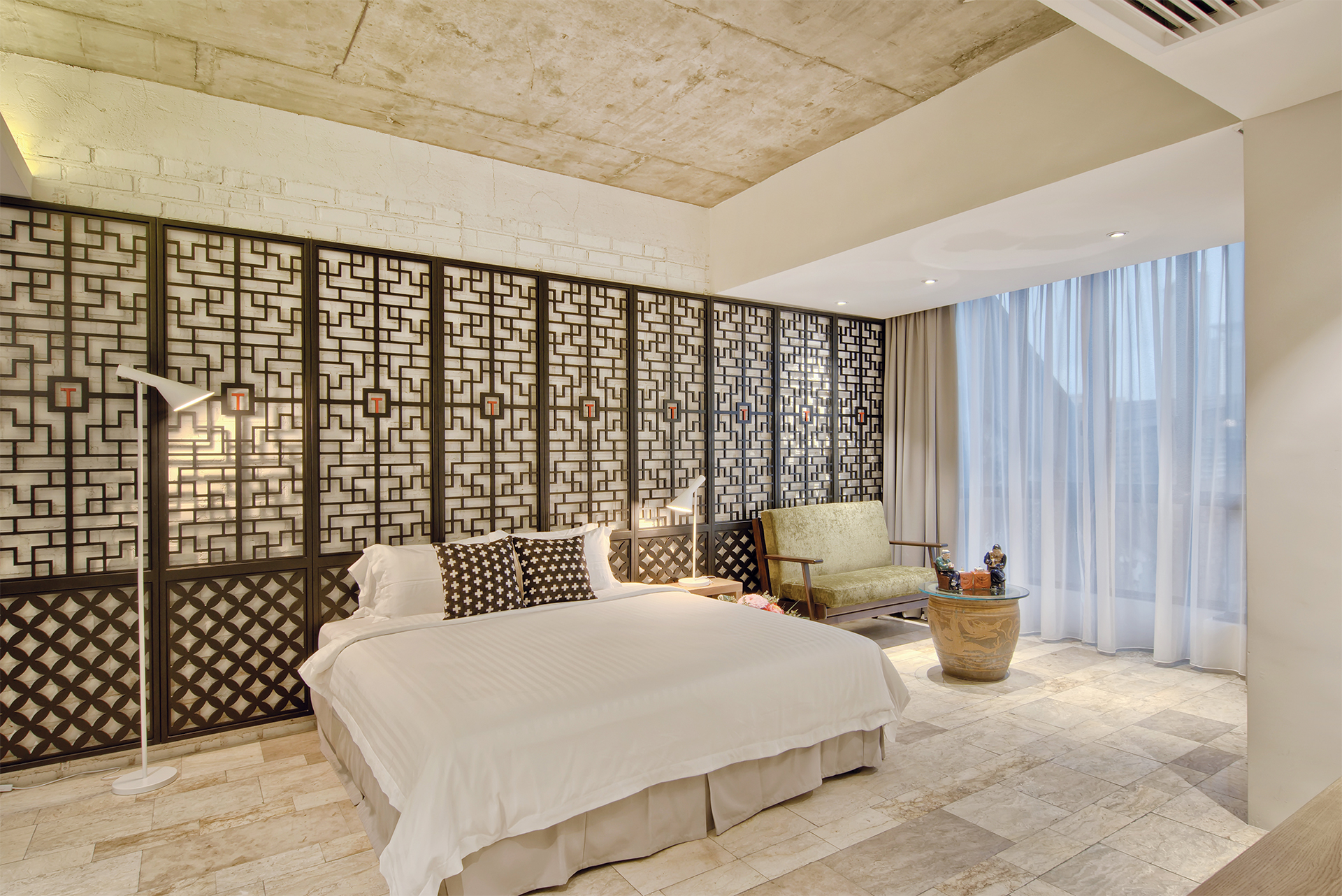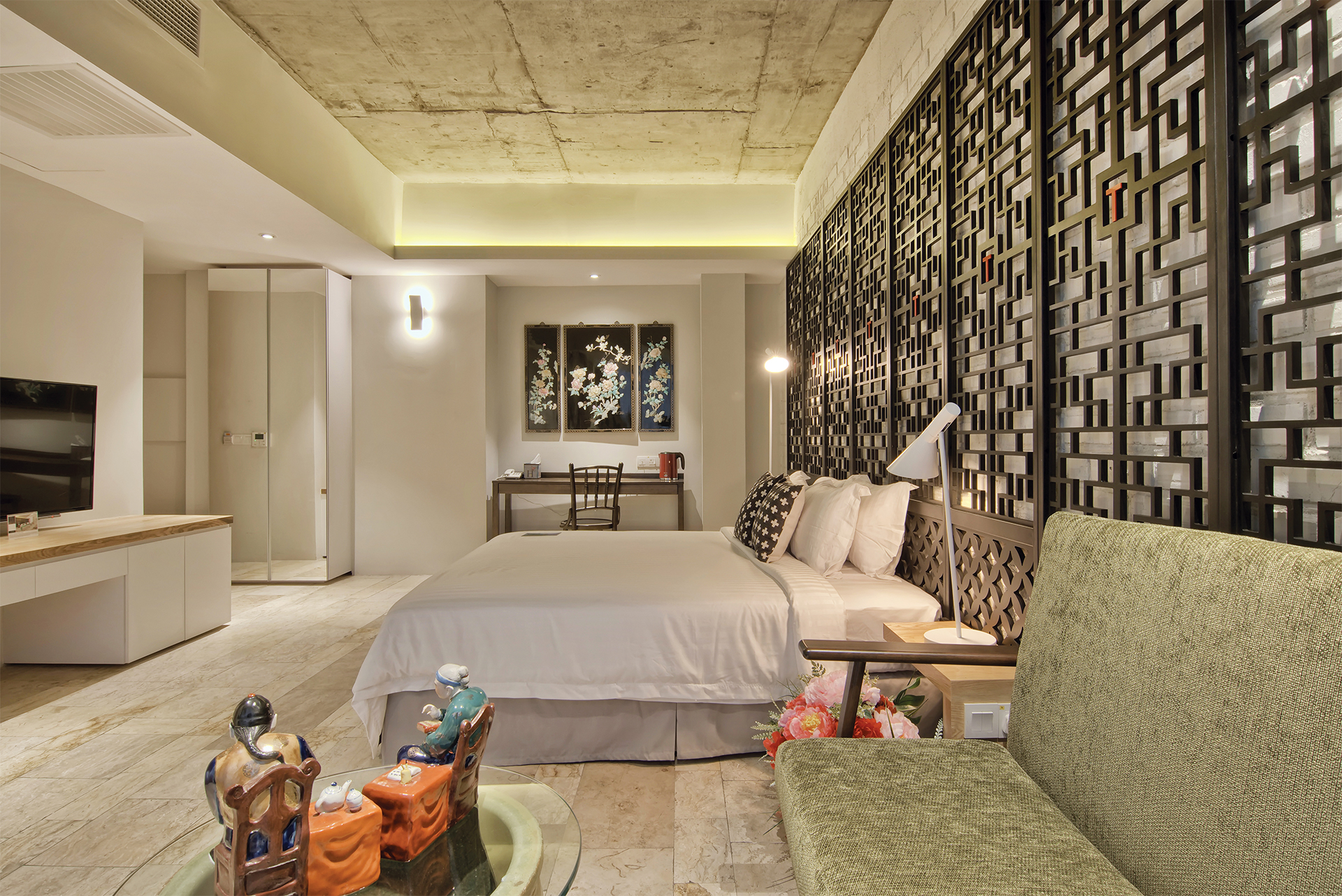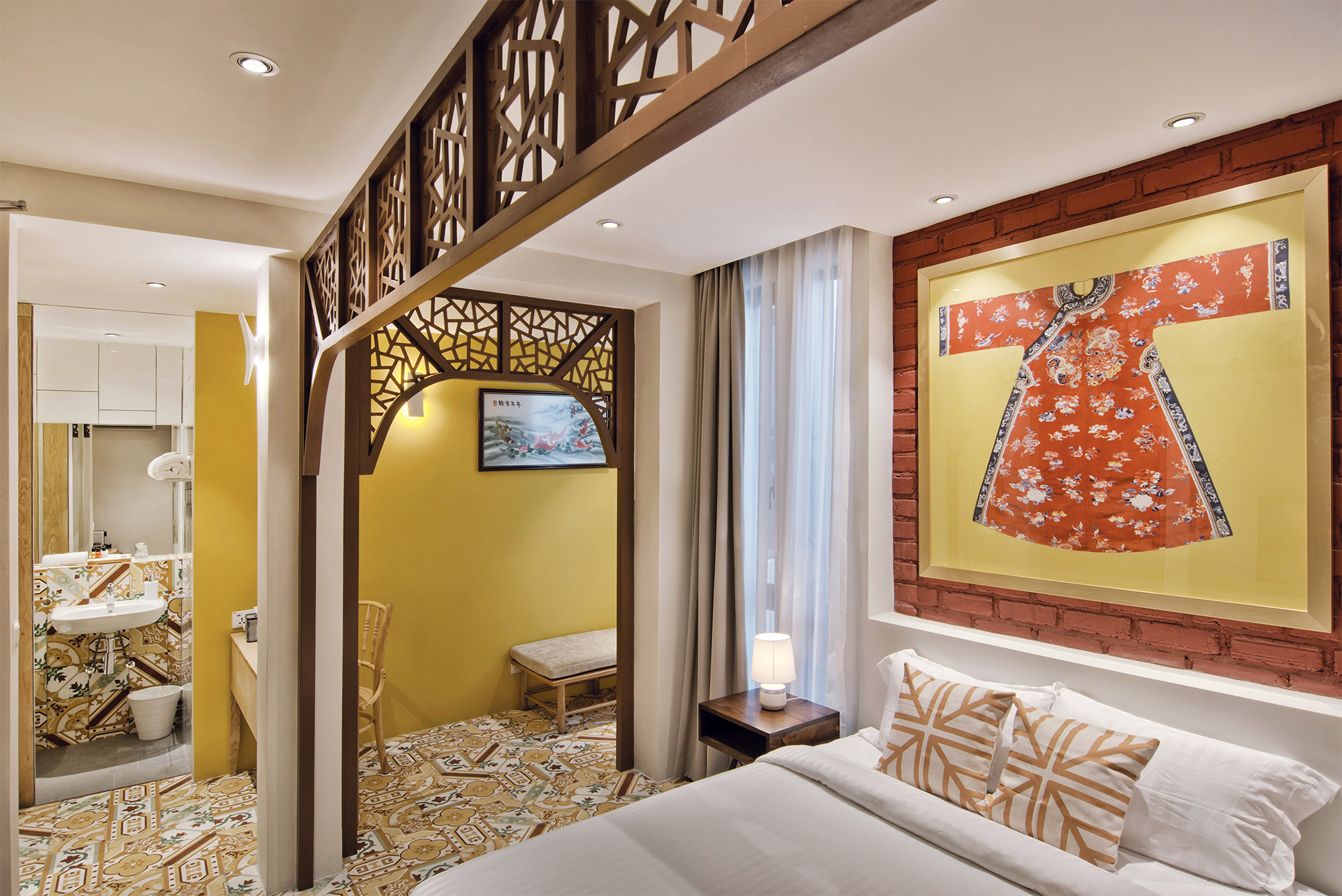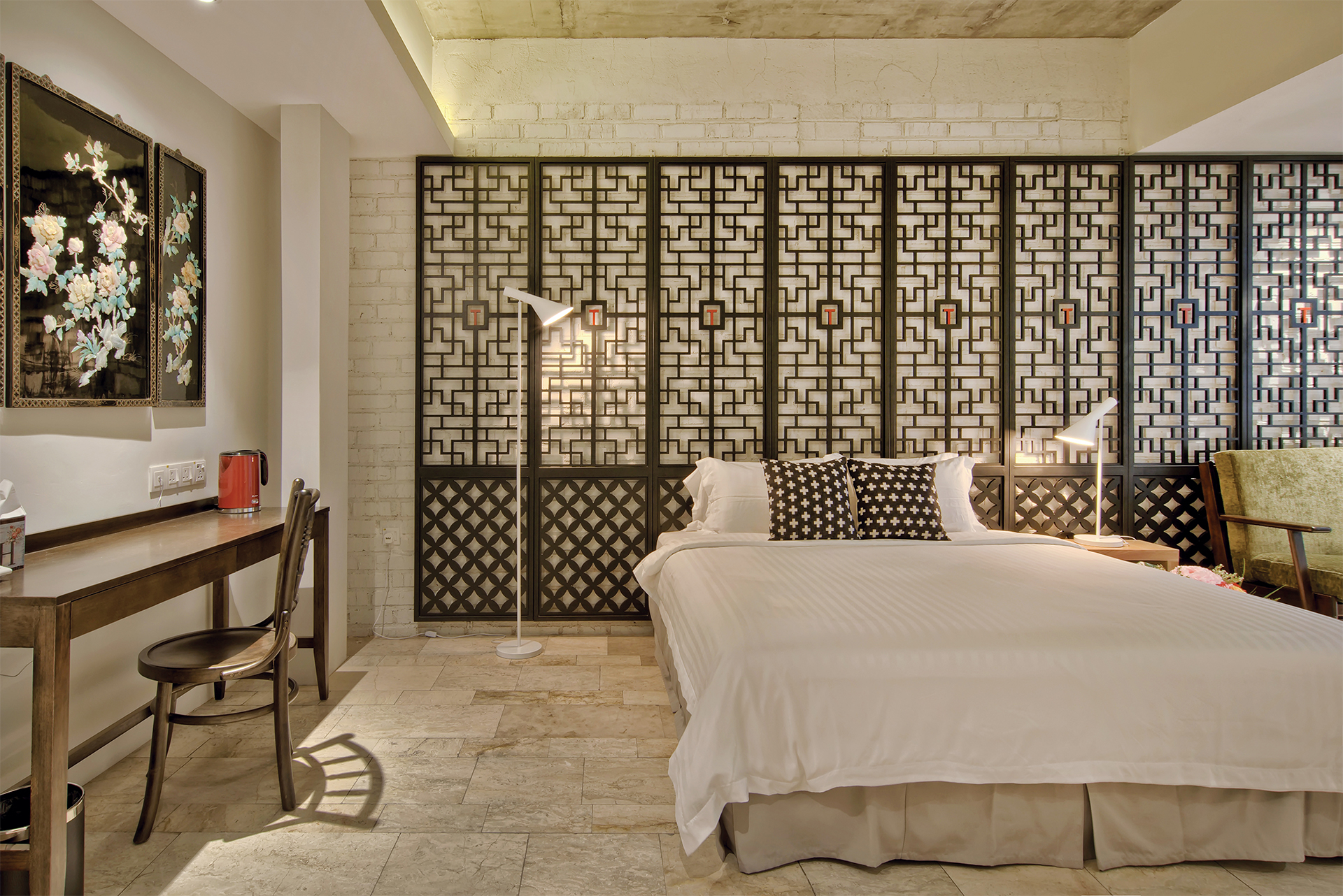 Traditional Chinese architecture is iconic for a variety of elaborate features, with latticework being one of its most recognisable. Seen in furnishings like doors, partitions, windows and folding screens, they boast of geometric motifs that are as much a visual treat as a study in Chinese symbolism. Presented as a wall installation in the Screen Suite, the time-honoured trait transforms into a contemporary art piece and lends a regal outlook to the generous space that fits a living lounge beside a cushy bed meant for two.