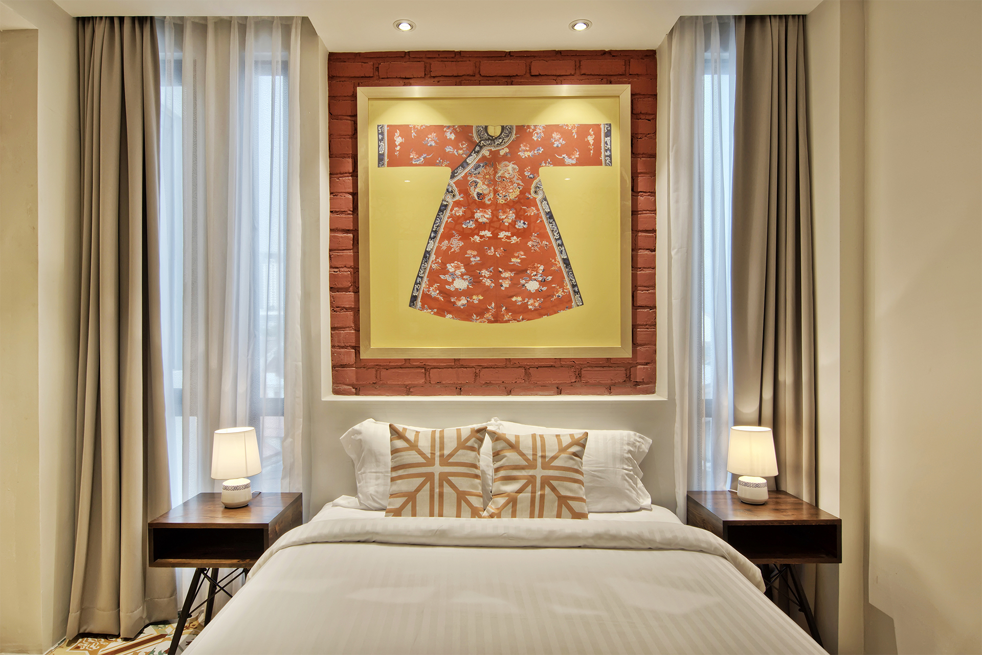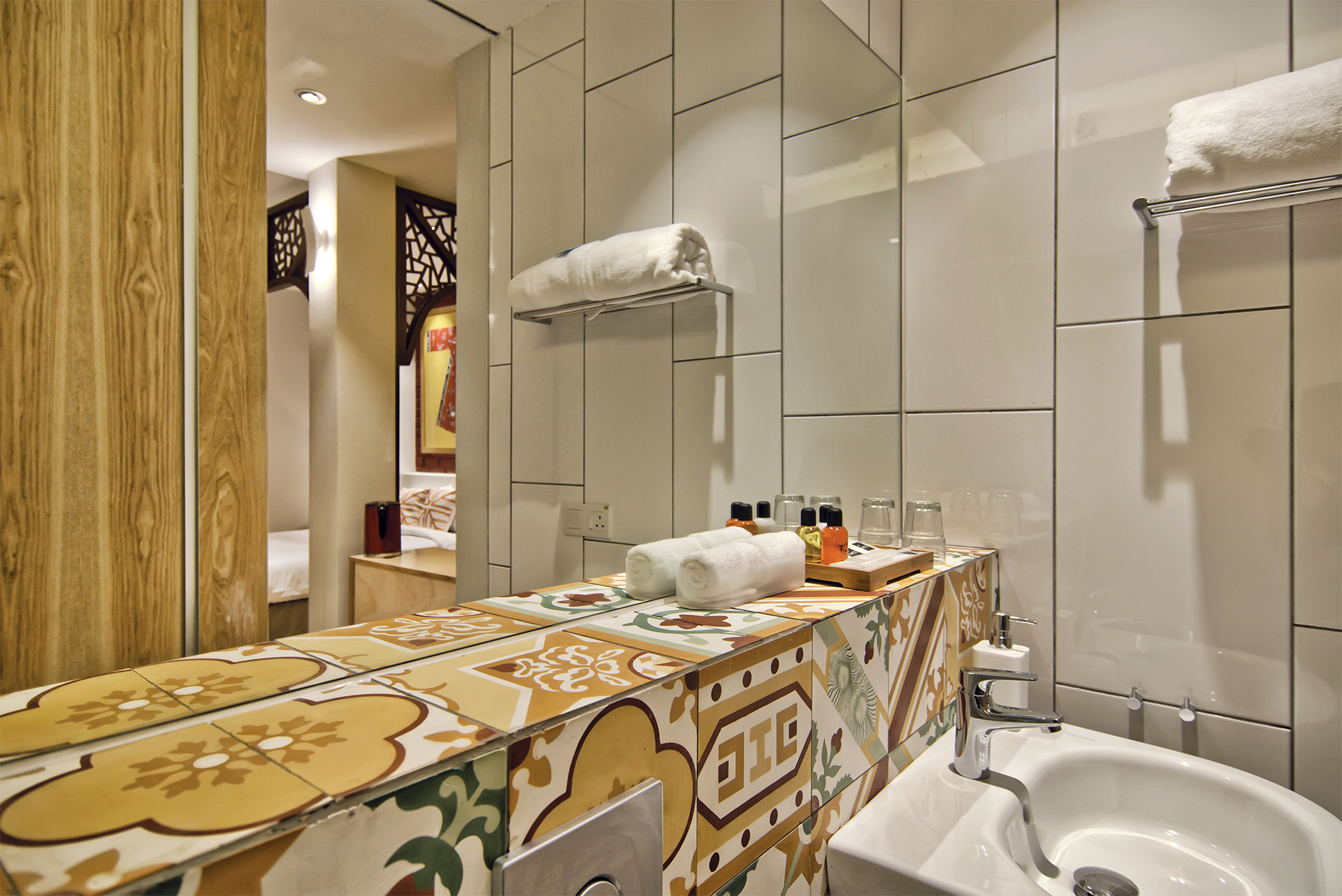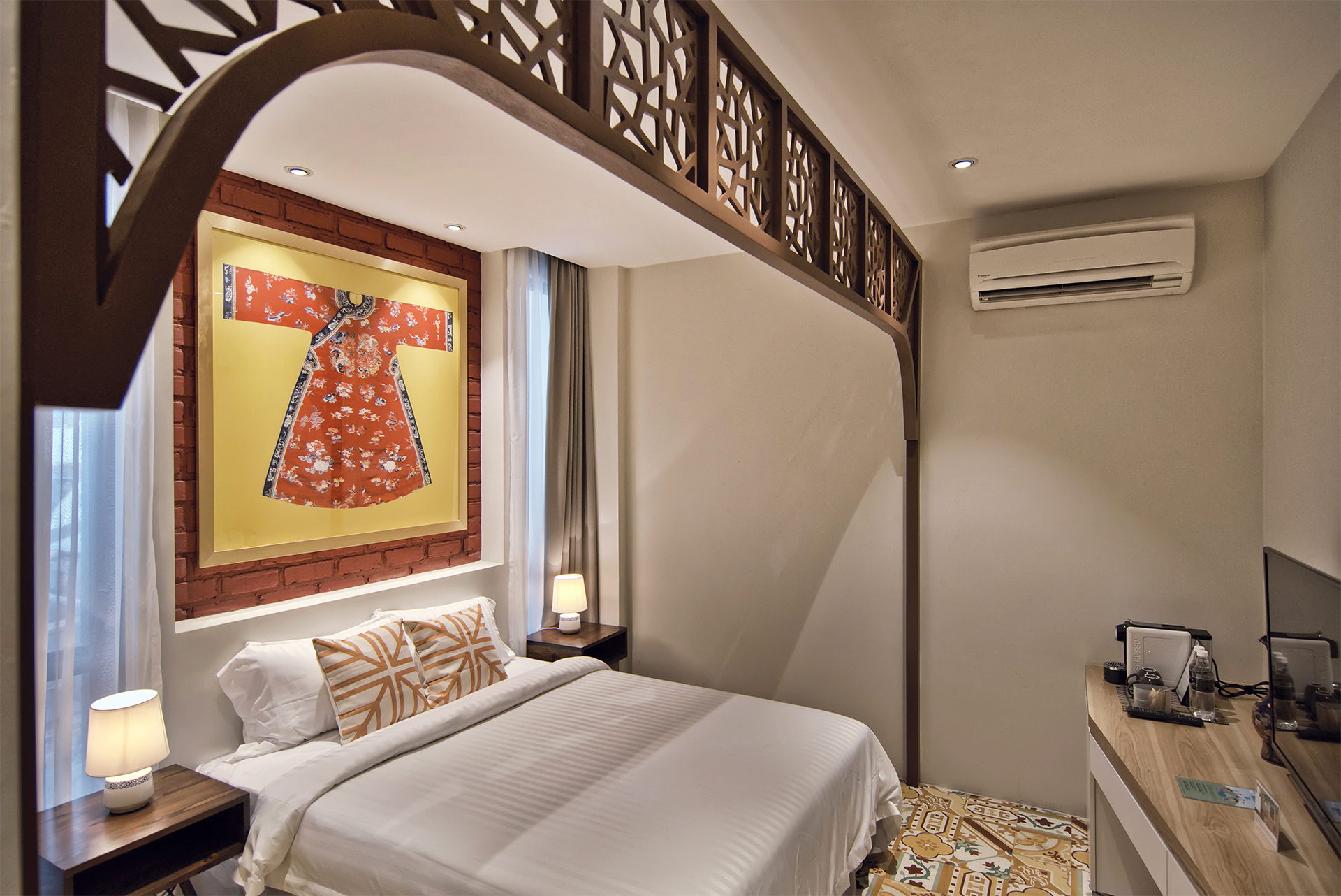 Traditional Chinese architecture is iconic for a variety of elaborate features, with latticework being one of its most recognisable. Seen in furnishings like doors, partitions, windows and folding screens, they boast of geometric motifs that are as much a visual treat as a study in Chinese symbolism. Presented as a wall installation in the Screen Suite, the time-honoured trait transforms into a contemporary art piece and lends a regal outlook to the generous space that fits a living lounge beside a cushy bed meant for two.
