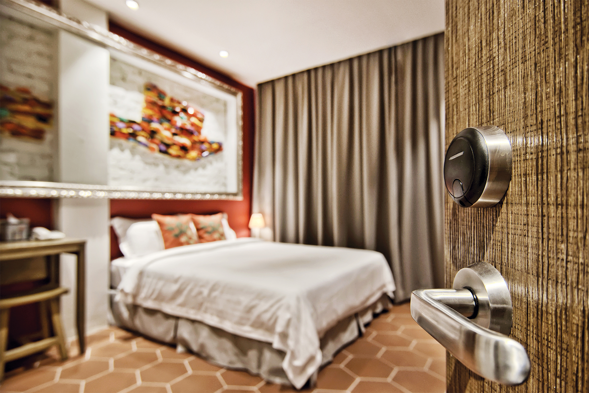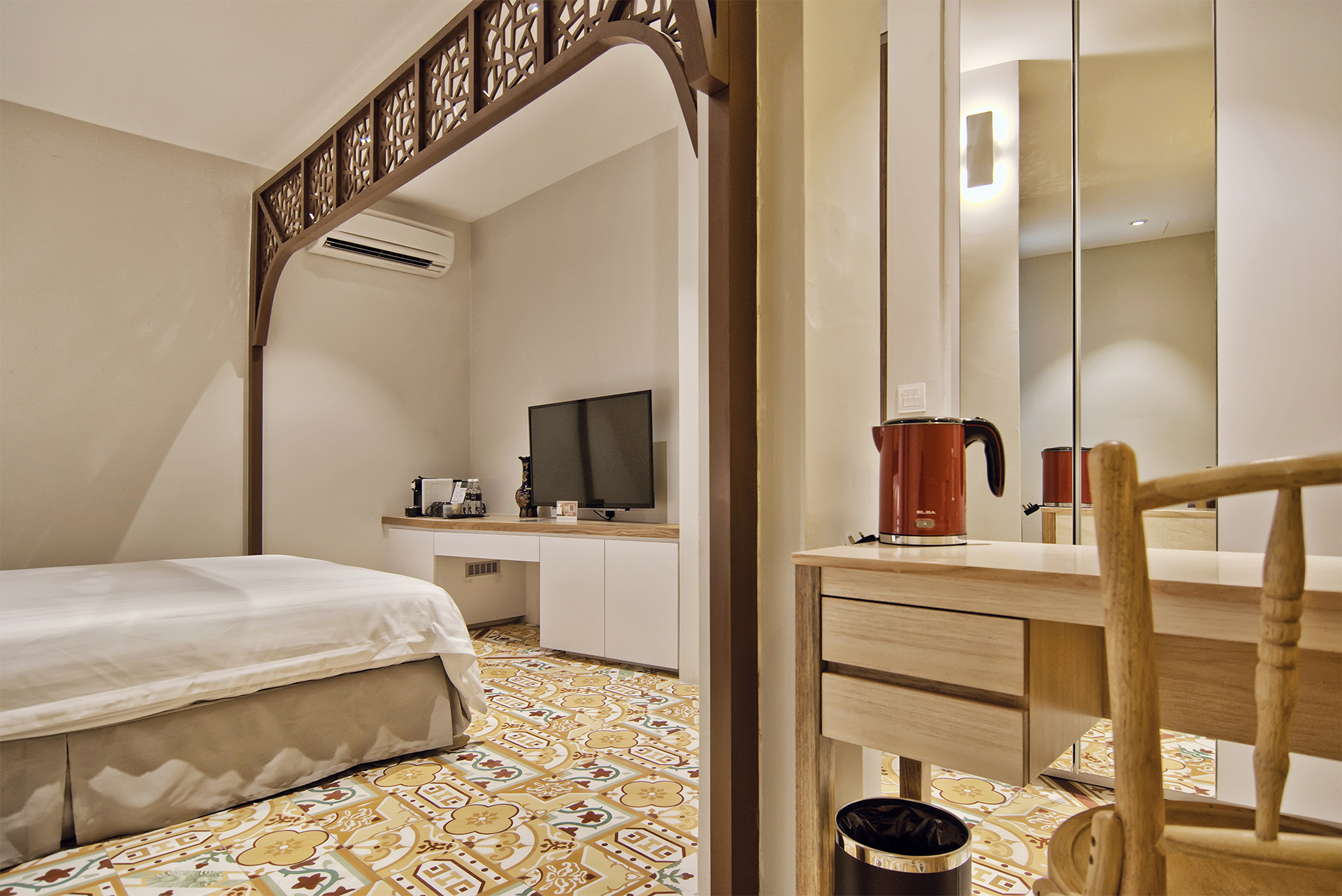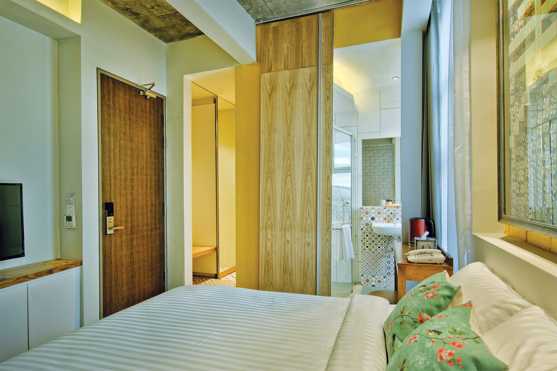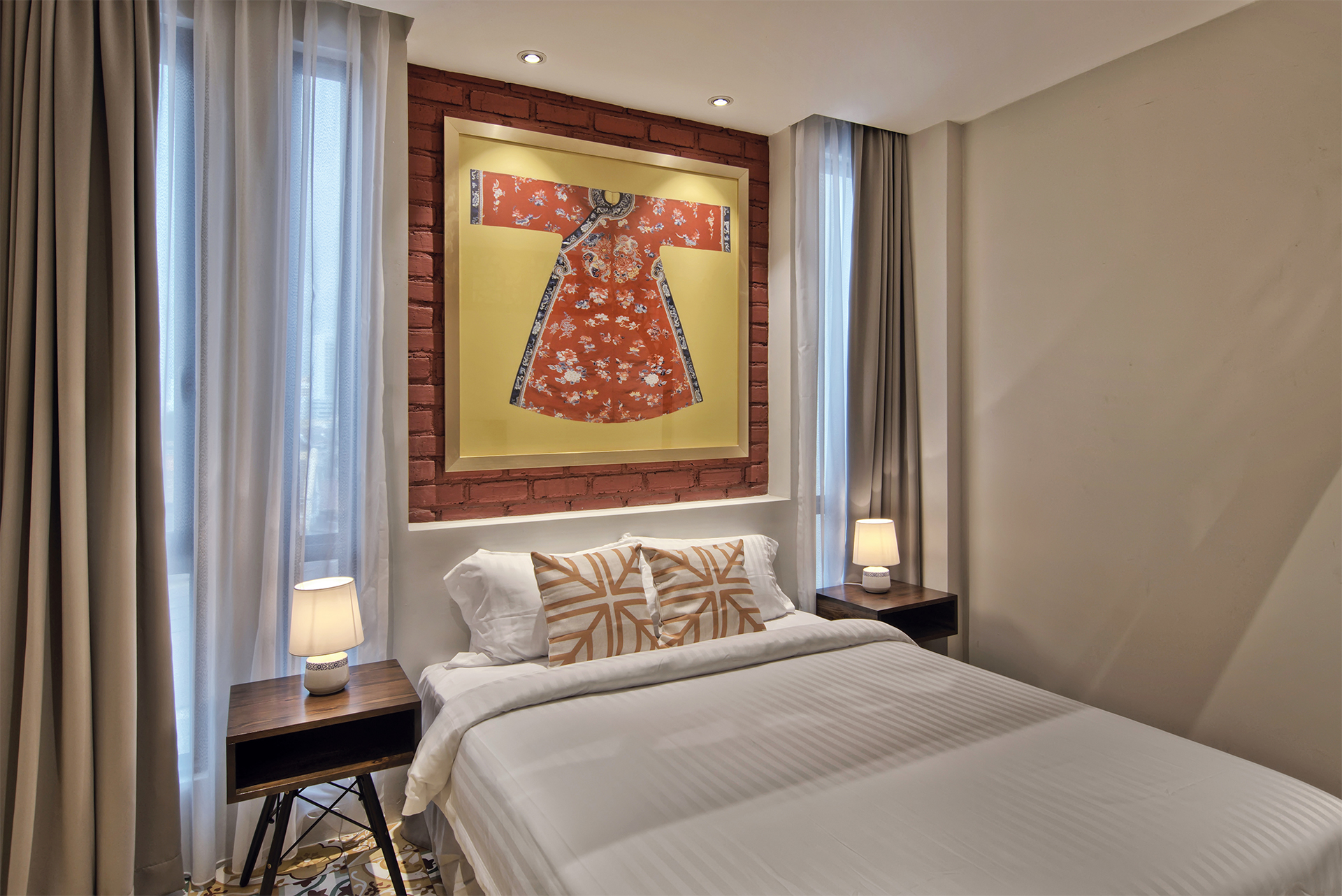 Traditional Chinese architecture is iconic for a variety of elaborate features, with latticework being one of its most recognisable. Seen in furnishings like doors, partitions, windows and folding screens, they boast of geometric motifs that are as much a visual treat as a study in Chinese symbolism. Presented as a wall installation in the Screen Suite, the time-honoured trait transforms into a contemporary art piece and lends a regal outlook to the generous space that fits a living lounge beside a cushy bed meant for two.