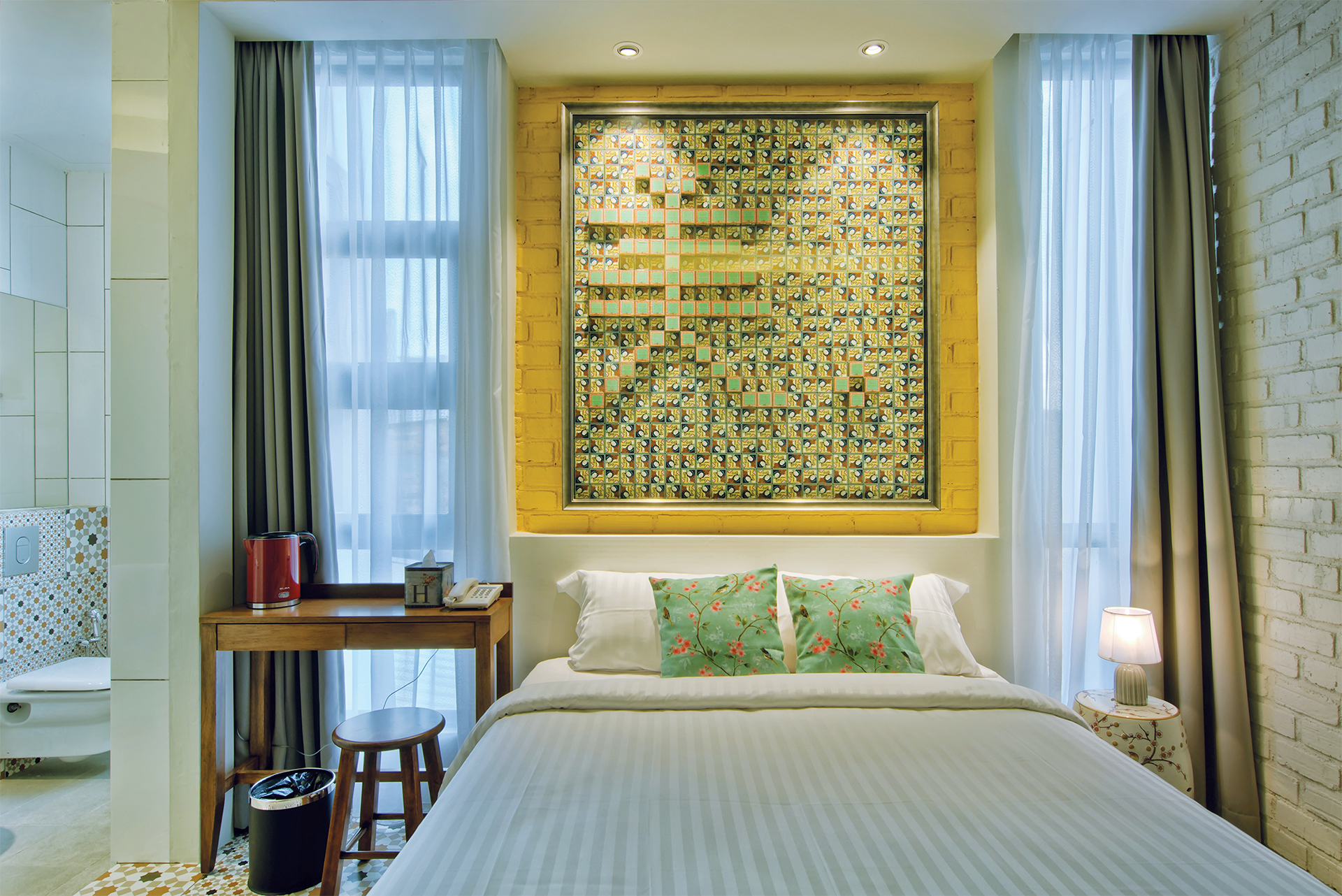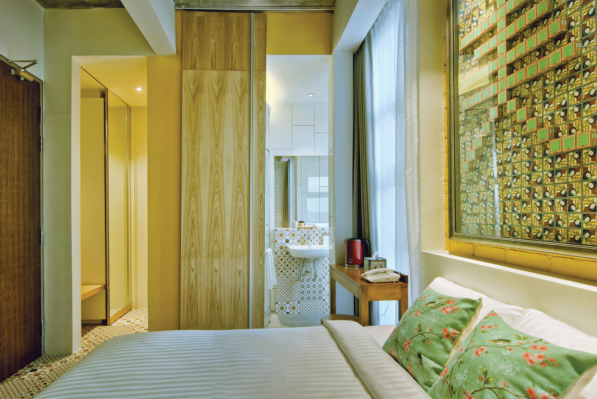She peeks from a corner, her flawless skin and heart-shaped pout framed by a 1920s-style crimped bob. A pair of Chinese gold coins float above two stalks of peony. You may not know the name but you know the gold-tinged box and you remember Sam Fong Hoi Tong as the white pressed powder that your mother or grandmother always had on her dressing table. In the Oriental Beauty Room, the petite powder cases make a statement in the form of the Chinese character for ‘beautiful’. Complemented by pastel patterned tiles and sanguine lemon hues, this tranquil room is a paean to timeless elegance.