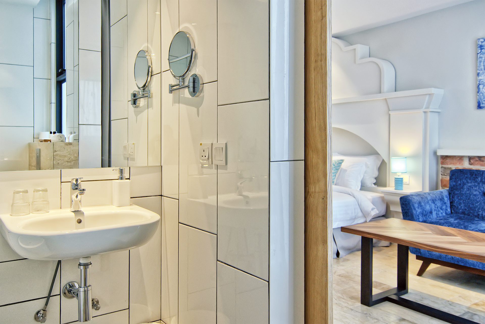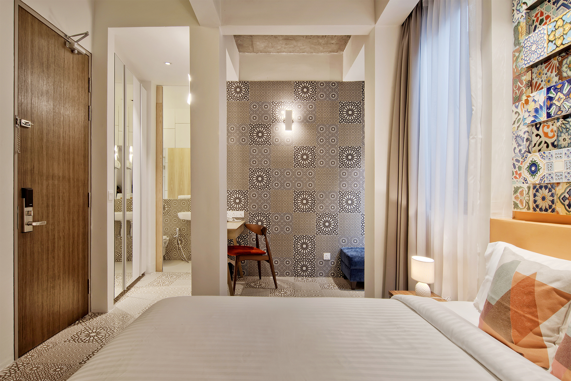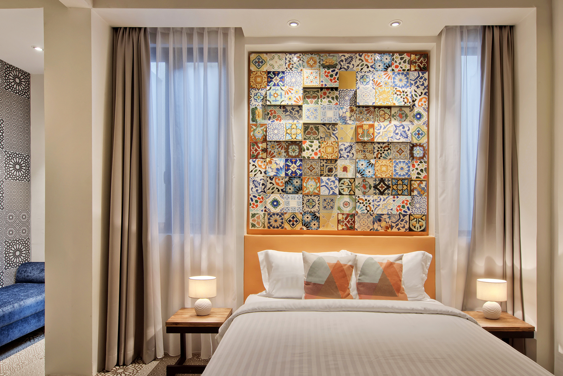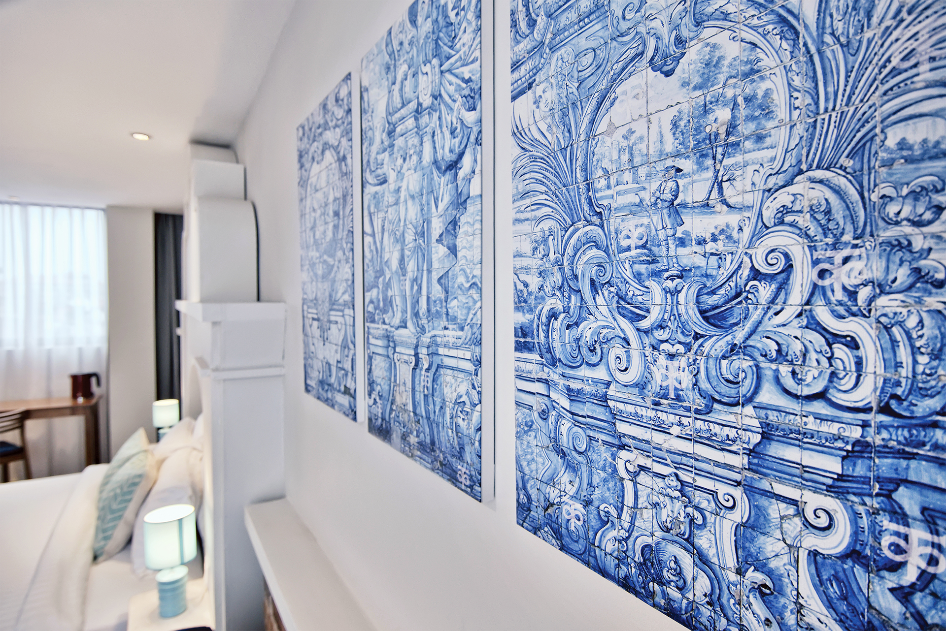 From the moment you step inside the Azulejos Room, the mosaic wall commands attention with its eye-catching collage of painted ceramic tiles glazed with tin. Popular in Portuguese architecture, these Azulejos tiles graced both the interiors and facades of palaces, churches, schools, and homes with swirls of vibrant colours and patterns that told of legends and historical milestones. More than just decorative, they also helped regulate temperature by protecting against heat and dampness. The tiles brighten up this well-lit room that sleeps two comfortably, with space for an additional bed.
